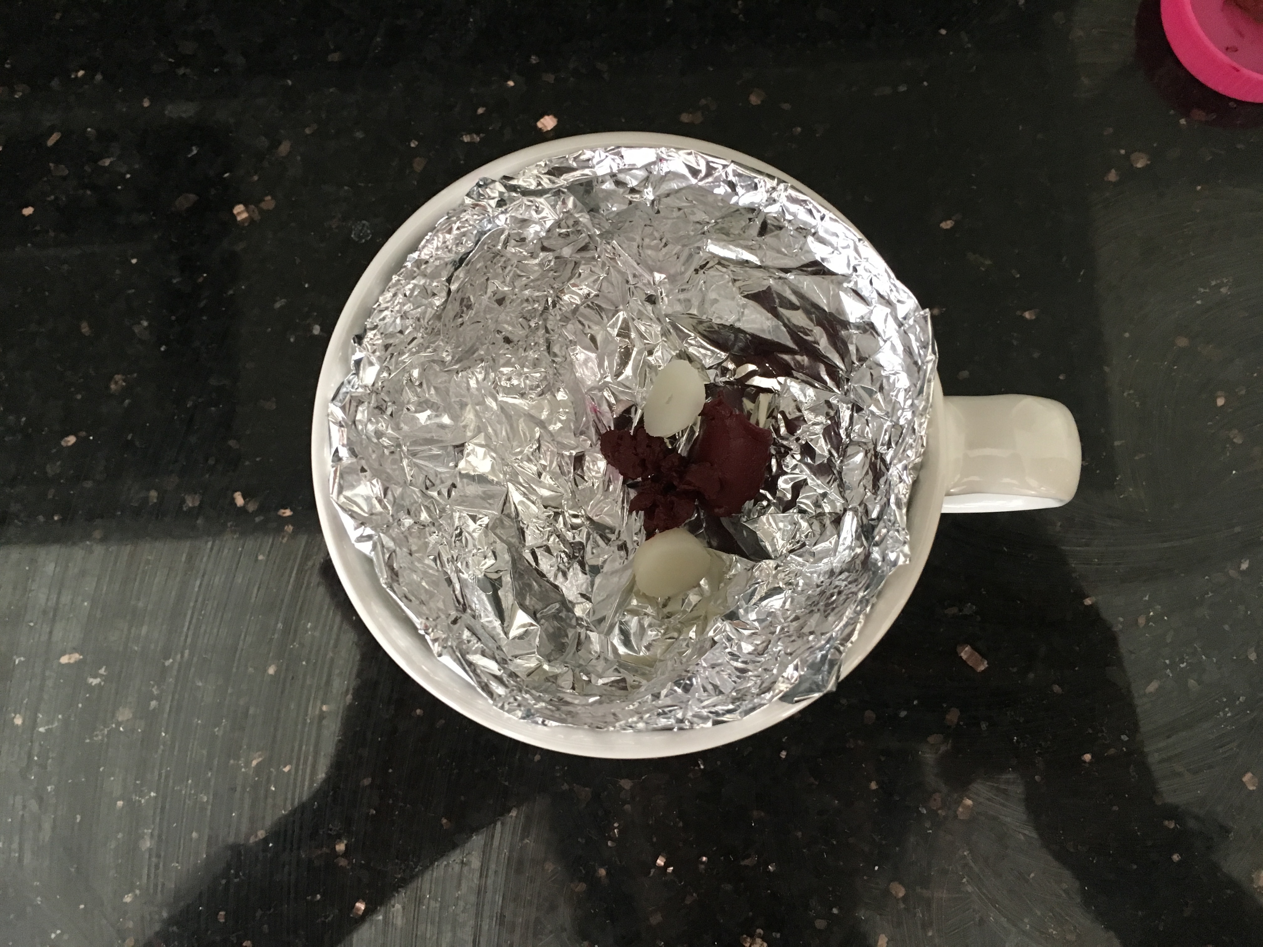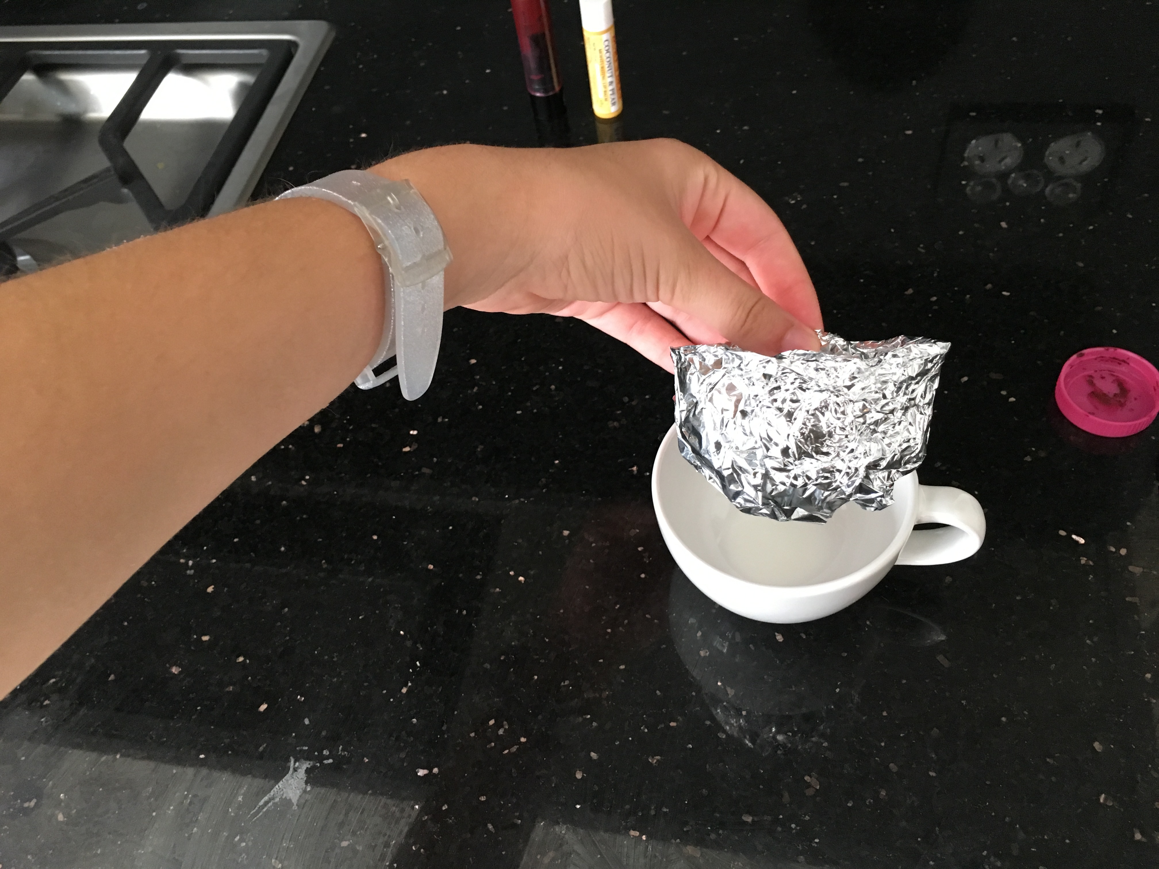 ☞ Forra una taza con papel de aluminio solo por dentro (ver foto).